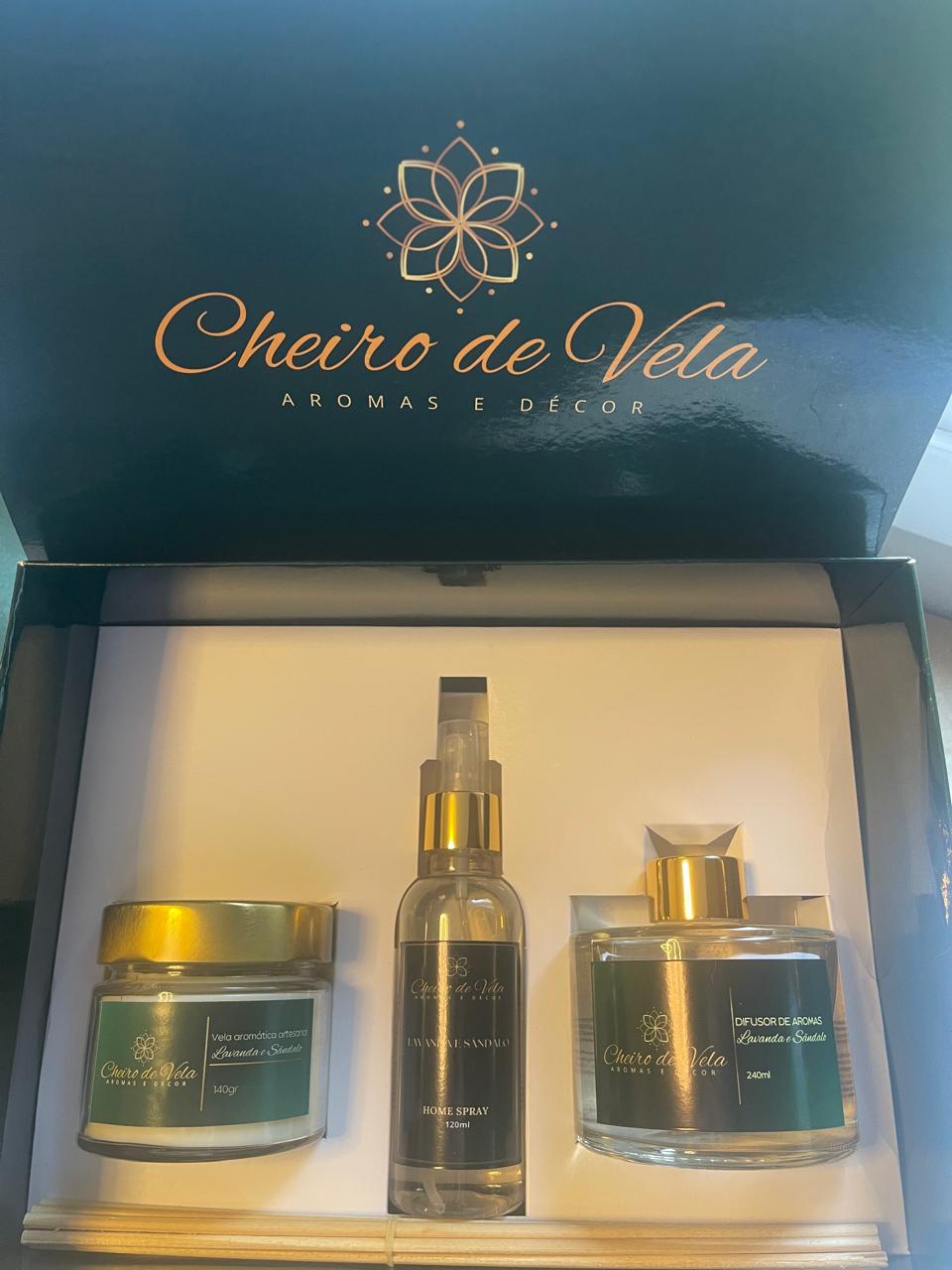KIT CAIXA PRESENTE COM 1 DIFUSOR DE AMBIENTE COM 240ML, 1 HOME SPRAY COM 120ML E 1 VELA COM 140GR.